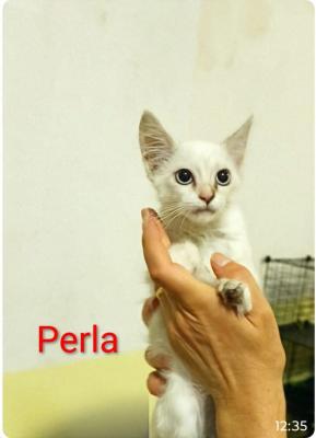 Perla (4 mesi): Una splendida gattina bianca con un manto semilungo e due magnifici occhi color ghiaccio che incantano. Come la sua amica Krizia, è dolcissima e molto affettuosa, cerca solo braccia che la stringano.