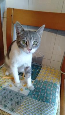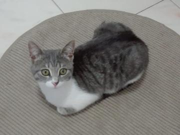 Grig é una gattina di tipo Europeo. 7 mesi. Grigia e bianca. Pelo corto. Ha una macchia scura sul nasino.