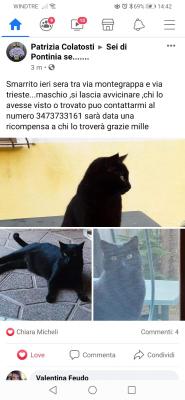 smarrito nei pressi di via montegrappa gatto nero castrato, se avete notizie contattatemi al numero 3473733161grazie