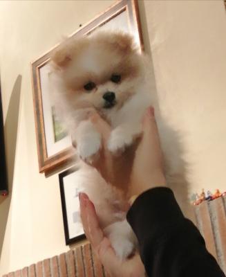 Cucciola di Spitz nano tedesco di circa 2 mesi, color crema e bianco. Nata in casa, sverminata e vaccinata, no pedigree, dolcissima. Cerca nuova famiglia. Prezzo 1000 euro trattabili