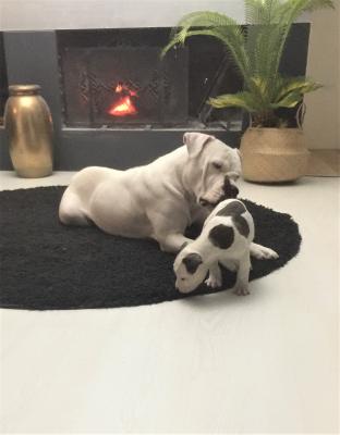 Stupendi cuccioli di bulldog americano: ottima morfologia, sono pronti per la cessione con libretto sanitario attestante profilassi vaccinale completa, somministrazione di calcio, vitamine, trattamenti antiparassitari e 4 sverminazioni. Ottimi cani da guardia e compagnia, già socializzati da genitori particolarmente equilibrati, sani e adatti a famiglie con bambini. (Sono noti per gli atti di eroismo nei confronti del padrone e della propria famiglia). Cediamo previo rimborso spese, a famiglie che siano pronti ad accoglierli, consapevoli di fare una scelta per la vita perché, è un cane devotissimo, ottimo guardiano che necessita del contatto e della presenza della famiglia e vi saprà ripagare con tanto affetto!