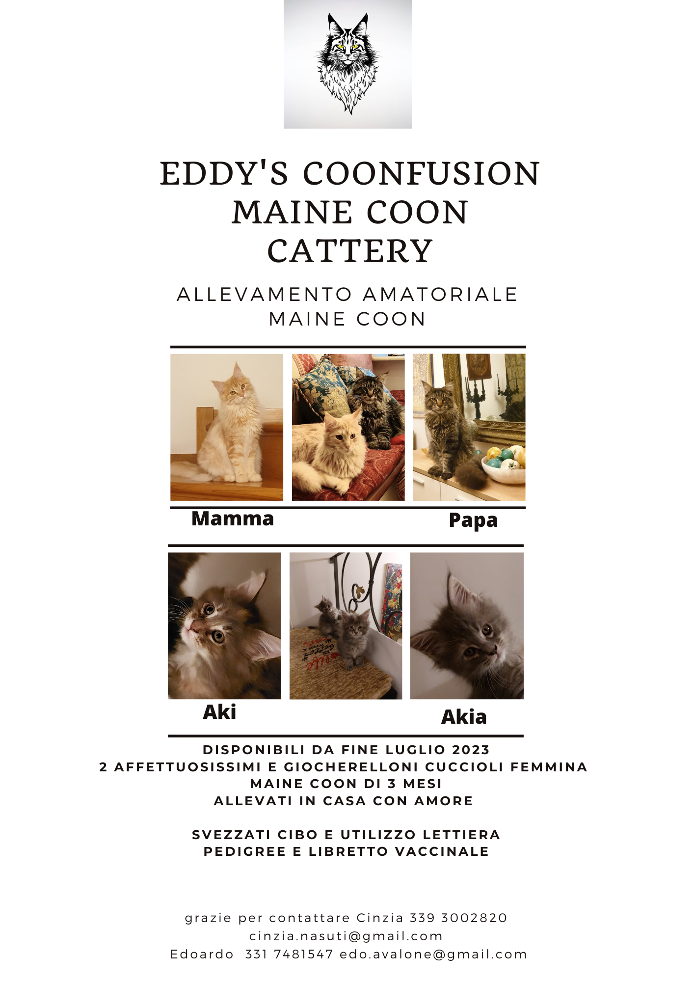 Vendiamo due bellissimi cuccioli Maine Coon femmina di tre mesi allevati con amore in allevamento amatoriale, Aki e Akia sono provvisti di pedrigri e libretto vaccinale. Si prega di scrivere sms, whatsapp, email.: cinzia.nasuti@gmail.com.