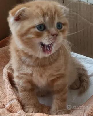 Disponibili per prenotazione fantastici cuccioli di Scottish fold, colori rarissimi, nati il 19-04-2022. La femminuccia è di color choccolate, i due maschietti Red e Silver Tabby. Giocherelloni, abituati all'uso della lettiera e tiragraffi, completamente autonomi, educati e cresciuti con amore in casa con bambini. Ogni gattino viene ceduto con rispettivo libretto sanitario, doppia sverminazione, vaccino trivalente e certificato di buona salute alla 12 settimana(entro il 13 Luglio). Entrambe i genitori visibili. Il papà è uno Scottish Straight, occhi azzurri di color Silver Tabby, la mamma è una Scottish fold Blue, testati dalle malattie Filv/Felv. C'è la possibilità di scambiarci un cucciolo, se si ha a disposizione una femminuccia di Scottish fold White. Per ulteriori foto o video non esitate a contattarmi su wathsapp