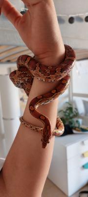 Coppia di serpenti del grano di 2 anni, con teca allestita come da foto, tappetino termico, termometro, vasca per l'acqua. Sono docili ed è facile prendersene cura. Ideali anche per bambini e principianti. Prezzo tutto compreso (trattabile) Possibile visionarli prendendo appuntamento
