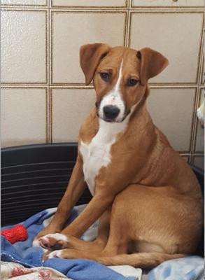 Ha circa 6 mesi, incrocio American Stafford, socievoli con gli altri cani, carattere equilibrato.