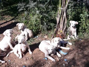 Sono 11 cuccioli, incrocio Labrador color crema, 6 femminucce e 3 maschietti, trovati, mentre una volontaria faceva il solito giro per dare cibo ai randagi, sentendo dei lamenti e pianti ha deciso di avvicinarsi alla zona “Oleificio†dove vi era un deposito di scarto delle olive, ecco che vede una grande macchia bianca (vedi foto allegata) su questa grande montagna di olive, erano 9 cuccioli terrorizzati, sporchi, unti che puzzavano di ogni, se non li avessero recuperati sarebbero morti di fame e di stenti.