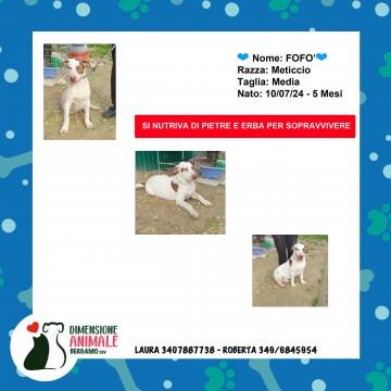 Fofo', 5 mesi (10/7/24), trovato in campagna che mangiava pietre ed erba per sopravvivere. Le solite cucciolate casalinghe, i cuccioli che non riescono a dare e buttano in campagna. Bello come il sole, occhi verde/ambra da farti innamorare, uno tsunami di simpatia e vitalità, un cucciolo gioioso, ama giocare a palla, adora le coccole, socializzato con i suoi simili.