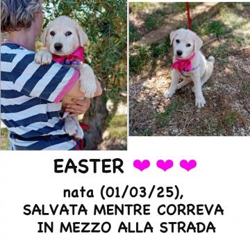 Easter, abbandonata il giorno di Pasqua! sarebbe morta in quella strada, era in mezzo la carreggiata disorientata e impaurita, bloccata dalla paura, per fortuna 2 signore l'hanno vista e si sono fermate a prenderla. Portata alle volontarie, Easter si è rivelata di una dolcezza unica, una cagnolina speciale, giocosa, amorevole, una nuvola di pelo, socializzata con tutti.