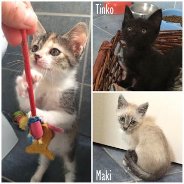 Tinko Trina e Maki tre gattini fantastici di nemmeno tre mesi abbandonati nella campagna sarda. Tinko un gattino soffice e setoso, un gattino elegante dal pelo scuro e dagli occhi brillanti. Trina una tricolore sveglia e tanto bellina e anche una grande giocherellona! Maki il coccolone del gruppo, un siamesino che è un vero spettacolo di gattino! A voi la scelta...ma non fateli aspettare! Loro sono già qui al nord vaccinati e sverminati...curiosi di conoscervi e speranzosi che qualcuno possa occuparsi di loro.