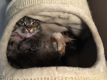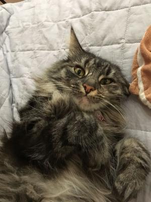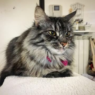 PITA E' UNA NORVEGESE DELLE FORESTE, FEMMINA, STERILIZZATA, DI 5 ANNI, PESO 4 KG, COLORE GRIGIO SCURO CON STRIATURE TIGRATE NERE, E’ UNA GATTA MOLTO DOCILE E NON HA MAI GRAFFIATO.