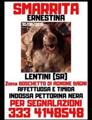 Ernestina si è persa il 10/08/2019 ad Agnone Bagni prov. di Siracusa. Da allora nessuna segnalazione sino a martedì 27/08 quando un ragazzo ha chiamato per dirci che aveva investito Ernestina sabato notte tra il 24 e il 25/08 (non aveva visto i tanti volantini che c'erano in zona). Il ragazzo si è subito premurato di chiamare chi di dovere per recuperarla, era spaventata, ferita e sdraiata in una aiuola tra autostrada e ingresso della SS114 dir. Lentini. NESSUNO ha risposto alle decine di chiamate, nè carabinieri, nè asl, nè cliniche veterinarie, nessuno. Ernestina è rimasta ferma nel suo punto dalle 23.00 sino alle 04.00 di mattina sino a quando ha trovato le forza per alzarsi e sparire di nuovo tra la vegetazione. Da allora nessuna chiamata, nessuna segnalazione. E' probabile che si aggiri di notte perchè è molto paurosa. Vi prego aiutateci a trovarla, se è ferita abbiamo poco tempo potrebbe morire da sola e nessuno merita questo. La sua famiglia la cerca disperatamente, vi prego aiutateci. PER SEGNALAZIONI 3334147548 oppure 3272263295 SI OFFRE RICOMPENSA