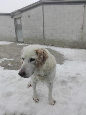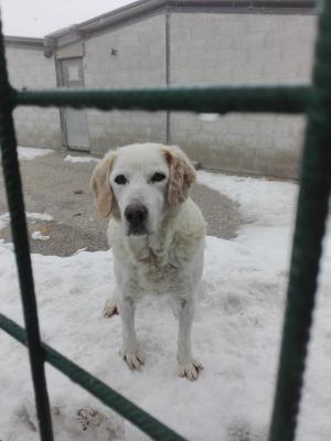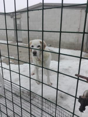 Labrador ha 12-13 anni, è molto bello, tutto bianco con il pelo morbido. E' in canile da quando aveva solo 1 anno, 12 anni di canile.