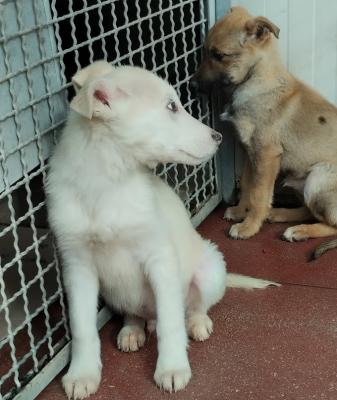 Ehi sorellina non aver paura, vuole solo fotografarci perchè spera che qualcuno ci adotti e ci tiri fuori da questa gabbia. Questo sembra voler dire Candido a Nocciolina, che vorrebbe sparire in quell'angolo. Questi sono i cuccioli in canile e cosi vivono!!! Purtroppo per loro due nessuna richiesta, li condanniamo a morte èperchè da adulti arriveranno a circa 16/18 kg.. ma tutti pare abbiano le case di Barbie e un cane non deve superare i 6 kg... Candido non rassicurare più la tua sorellina, quel bos sarà per sempre la vostra casa SCHEDA: