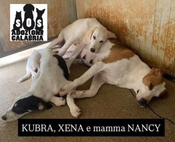 UN TENERO QUADRETTO DI FAMIGLIA SE NON FOSSE PER LA LORO CONDANNA ALL’ERGASTOLO! NANCY è una mamma perfetta, un cane equilibrato, docile, paziente, amorevole, delicato, discreto, amabile in tutto e per tutto. Nonostante la reclusione e il disagio di dover allevare i propri cuccioli in quelle condizioni di vita, NANCY ha mantenuto saldo il suo ruolo e ha fornito (e continua a fornire) a tutti i suoi cuccioli gli elementi educativi di base per diventare dei cani affidabili e sereni. Ma non può finire così… non può finire tutto su quella lastra di cemento… tutto questo Amore non può morire prigioniero di un box e quel box lo dobbiamo SVUOTARE! KUBRA (bianca e nera) e XENA (tutta bianca) hanno compiuto 5 mesi il 20 giugno. Sono entrambe dolcissime oltre che belle, sane, vaccinate, microchippate, sverminate e pronte per raggiungere ognuna la sua famiglia, sempre che esista da qualche parte d’Italia… NANCY è nata presumibilmente nel 2023, pesa poco più di 20kg, sa andare al guinzaglio, va d’accordo con i suoi simili di entrambi i sessi, è una segugia e i segugi sono una garanzia! Dobbiamo rassegnarci all’idea di vederle marcire in canile? Le affidiamo separatamente. Dalla Calabria possono arrivare anche al centro e al nord. NO altre regioni ad alto tasso di randagism