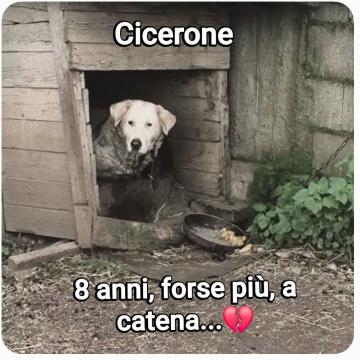 CICERONE ADOZIONE DEL CUORE È iniziato tutto quando ero solo un cucciolo. Sono stato portato via dalla mia mamma, mi hanno portato in una campagna e mi hanno legato a catena. Per circa 7 lunghi anni la mia cuccia è stato un bidone di ferro. Ho mangiato sempre e solo avanzi. Sono stato picchiato tante volte per "imparare". Crescendo la catena ha lacerato il mio collo, i miei padroni non hanno mai pensato di cambiarla. Non ho mai giocato con un altro cane. Non sono mai stato accarezzato. Non ho mai potuto fare una corsa. Eppure, sono un cane buono. Ho scodinzolato subito alle volontarie che sono venute a salvarmi. Sono salito nella loro auto tutto contento. Mi hanno tolto la catena dalla carne. Mi hanno fatto correre. Mi hanno dato tante carezze. E mi hanno fatto dormire su un soffice cuscino. E per me tutto questo è bellissimo, peccato che duri troppo poco. Le volontarie hanno tanti cani e il tempo da poter dedicare a ognuno di noi è poco. Stanno così provando a cercare una brava famiglia per me. Ci stanno provando tanto ma purtroppo ancora nulla. Sono Cicerone, ho circa 7 anni, peso circa 20 k, sono un cane buono e socievole, e convivo abbastanza pacificamente con altri animali.