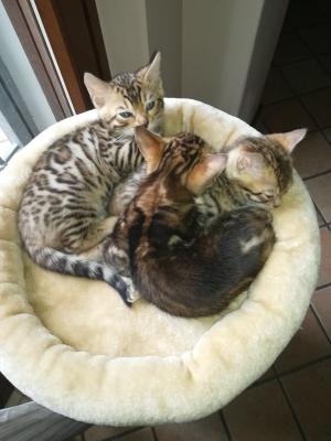 Bellissimi cuccioli di bengala di due mesi da crescere secondo le proprie esigenze, di altissima genealogia. Sono nati e cresciuti in casa privata con la famiglia, i cuccioli sono già abituati alla cassetta. Estremamente docili ed affettuosi come i genitori che sono visibili ed esenti da malattie infettive. Verranno ceduti con le vaccinazioni, sverminazione e pedigree Anfi. Possibilità di averli anche da riproduzione/mostra. tel. 3394350472