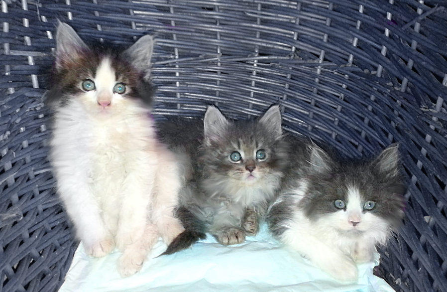 Gattini Norvegesi di due mesi e mezzo, cresciuti in ambiente domestico, ormai già svezzati sverminati e vaccinati, sono abituati alla casa e ai bambini, hanno un carattere molto dolce (li proponiamo anche per semplice compagnia a prezzo ridotto), visibili su appuntamento insieme alla Mammagatta e al Papàgatto ( entrambi pedigree WCF-AFI ).
