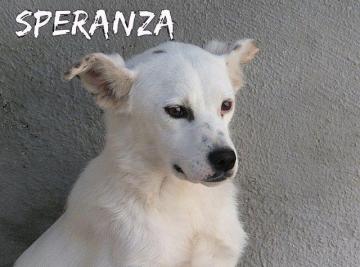 Speranza è una cagnolina di taglia medio contenuta sui 15 kg, tutta bianca con due occhioni tristi di chi ha visto gia’ tante cose brutte e ha paura di rischiare ancora una delusione.
