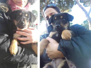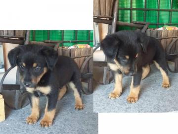 Portato dal veterinario che ha verificato che si tratta di maschio taglia medio grande (25/30 kg), di circa due mesi e mezzo; non si è pronunciato sull’ incrocio, ma sembra somigliare ad un lupotto, forse incrocio con un rottweiler per via dei colori, ma è difficile dirsi.