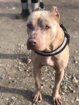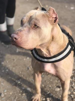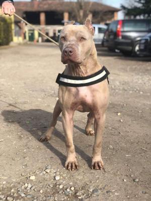 Pino è un bellissimo pittbull adulto. È stato trovato in Puglia in una piscina con mezzo metro di acqua, nel 2017, è stato poi portato in pensione a Milano, dove si è completamente ripreso.