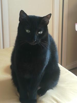 gattina nera di tre anni di nome Oliver senza collare ma con tatuaggio blu nell' orecchio e sul ventre si lascia avvicinare ha un po' il pancino a penzoloni come avesse partorito ma è sterilizzata
