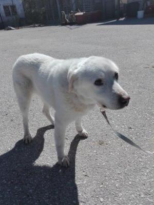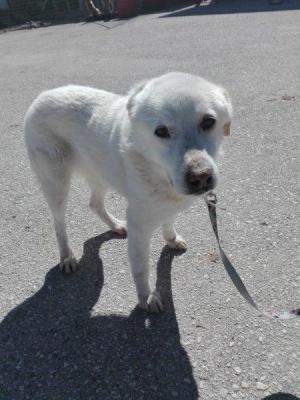 Paloma è bella, ha il mantello raso completamente bianco, il muso dolce e gli occhi teneri di una cucciola, che nonostante i suoi 12 anni spiccano scuri e vivi nel suo mantello.