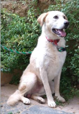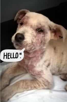 Vi presentiamo BIANCHINO, quando è stato trovato, la dermatite lo stava “divorando”, denutrito, gli si vedevano solo le costole, si contavano una ad una, la pelle era attaccata alla ossa.
