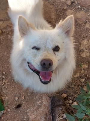 Gue' alias Chicco È uno splendido volpino di soli 12 kg e 2 anni e mezzo! Potrei dirvi che sta morendo Che finirà in canile Che piange tutto il giorno etc etc etc E invece no!!!! È un cane che quando arrivi nel suo recinto ti abbraccia e a modo suo ti parla e ti fa sentire l'amore!!! Quello vero!!!! Non le chiacchiere!!! Ho un occhio che chissà dov'è andato a finire