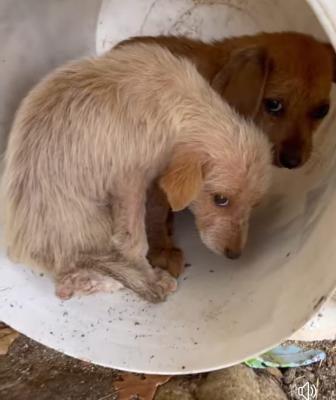 Tre cuccioli abbandonati malati pelle ed ossa hanno bisogno di uno stallo o di qualcuno che se ne può prendere cura. Sono in condizioni pietose sotto la pioggia battente hanno trovato rifugio in un secchio