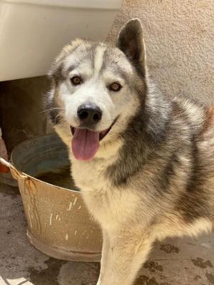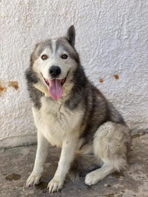 SIBERIAN MALAMUT INCR., 2 ANNI, ZEUS, TROVATO CON L'ORECCHIO MOZZATO E LEGATO AD UN TETTO