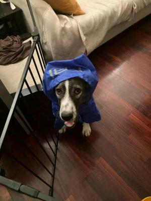 Non ha problemi con i bisogni che è già abituato a fare fuori. Esce in pettorina ed abituato al guinzaglio.