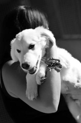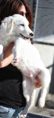 Cucciolo incr. GOLDEN/MAREMMANO, data di nascita il 06/06/23, chiuso in una gabbia di 2 mt x 2 mt.