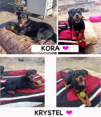 Krystal e Kora, maestose Rottweiler di 2 anni (01/12/23), Krystal e Kora, sono state viste mentre le facevano scendere da un furgone bianco che è andato via di corsa, lasciandole lì, smarrite, confuse e molto magre. Vanno d'accordo con i loro simili ma non con i gatti, amano giocare a palla ma amano soprattutto le persone, il contatto. Krystal (collare nero/rosso) ha un carattere più deciso, Kora è un po' più sottomessa, sono entrambe due bellissimi esemplari.