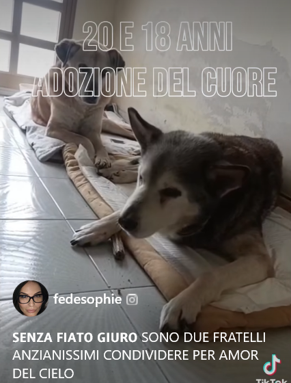 ANOUK e BADDY hanno 20 e 18 anni. La loro mamma umana è volata in cielo e loro sono rimasti completamente soli, si fanno forza l'uno con l'altro. NON POSSIAMO SEPARARLI, MORIREBBERO. Hanno bisogno di una famiglia SUBITO, al più presto. Sono buoni come il pane e abituati al contatto con i gatti. Anouk si stava lasciando morire ma la presenza del suo fratellino lo sta aiutando molto. Si affidano nelle zone di Trapani e Palermo perche' non possono sostenere un viaggio troppo lungo! Chi volesse darci una mano o volesse adottarli può inviare un whatsapp al 3389023233