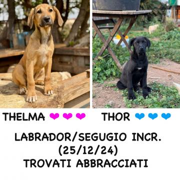 THOR e THELMA, 4 MESI (25/12/24), TAGLIA MEDIO/GRANDE, MIX SEGUGIO/LABRADOR, TROVATI ABBRACCIATI UNA FREDDA GIORNATA INVERNALE