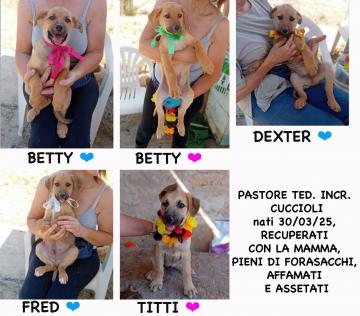 Vi presentiamo le 5 meraviglie FRED, CASPER, DEXTER, BETTY e TITTI (Eric il sesto è stato prenotato), recuperati con la mamma PASTORE TEDESCO PURO, in condizioni pietose, affamati, assetati e pieni di forasacchi.