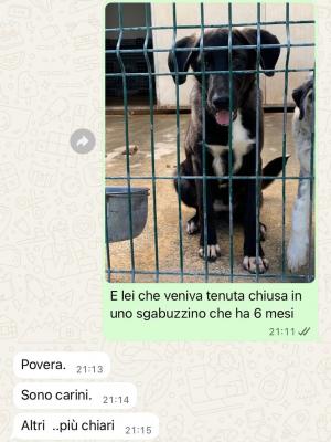 RINA era chiusa in uno sgabuzzino tra le sue feci, Rina ha sofferto tantissimo! Rina vive reclusa in un box H24, dorme sul cemento umido d’inverno, non esce mai, non gioca, non vive! E noi di cosa ci preoccupiamo? Del colore! Come si fa!? Ma come si fa!? A non essere sull’orlo di una crisi di nervi! Per favore esiste al mondo qualcuno che abbia PIETÀ e COMPASSIONE di una cucciola che non ha scelto di nascere e che è passata da un aguzzino a un box di canile? Se esiste ci scriva perché abbiamo bisogno di recuperare un po’ di fiducia nell’essere umano! Nata i primi di maggio, futura taglia medio grande, socievole nonostante tutto. Dalla Calabria può arrivare al centro e al nord.