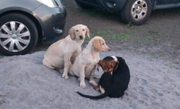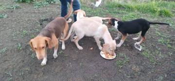 Mamma e tre cuccioli maschi di circa 4 mesi , , sono stati abbandonati in strada Incrocio cani da caccia tipo Beagle sono molto socievoli quindi sicuramente cucciolata casalinga