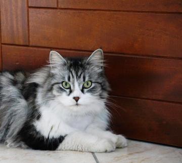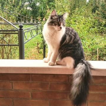 SMARRITO GATTO MASCHIO CASTRATO TIGRATO NERO-GRIGIO E BIANCO CON PELO LUNGO RASATO SUI FIANCHI. HA 4 ANNI . RISPONDE AL NOME DI FIOCCO.