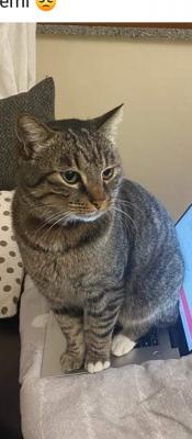 Smarrito gatto grigio con collarino marrone scuro, zampette posteriore bianche ,anteriori sinistra zampetta parzialmente bianca e destra grigia,maschio sterilizzato