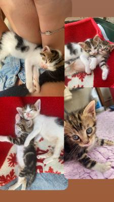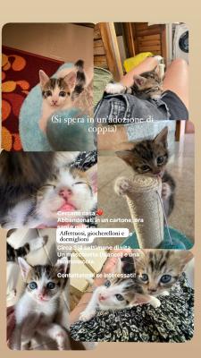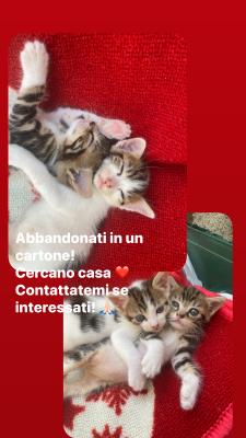 I gattini sono stata abbandonati in un cartone circa 20 giorni fa. Ora sono sani e puliti, svezzati e autonomi nell’uso della lettiera. Sono un maschietto e una femminuccia. Affettuosi, dormiglioni e giocherelloni. Pieni di vita e d’amore. Mi piacerebbe non dividerli, poiché sono in simbiosi per ogni cosa che debbano fare.