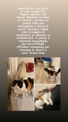 Smarrita gatta in zona campo San Angelo, sestiere San Marco. Risponde al nome di “Sisetta”, portava un collare rosso con una medaglietta a forma di cuore. Chiunque l’abbia vista è pregato di contattarmi al cellulare al 3408931255. O anche presso il ristorante AcquaPazza allo 0412770688. Offriamo ricompensa per chiunque la riporti a casa. Grazie mille
