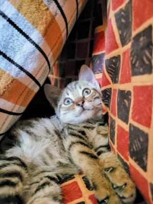 Boo è una gattina di 60 giorni. Per ora vive in un box per la sua sicurezza, perché chi l'ha salvata ha un cane con forte istinto predatorio. È stata recuperata dal motore di una macchina, dopo essere rimasta chiusa in un garage privato per 3 giorni senza acqua e senza cibo. Da lì ha iniziato a miagolare per la disperazione fino a rimanere senza più voce.
