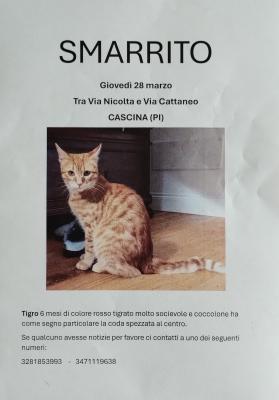 Tigro 6 mesi è scomparso la sera di Giovedì 28 marzo. È molto socievole e affettuoso. Si può riconoscere dalla coda che al centro è storta, come se fosse spezzata. Per favore chiunque abbia notizie ci chiami ad uno dei seguenti numeri 3471119638 - 3281853993