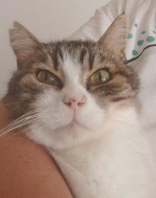 SMARRITA BIRBA, GATTA DI PICCOLA COSTITUZIONE, BIANCA E TIGRATA NERO/MARRONE