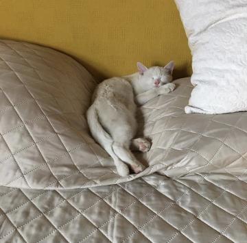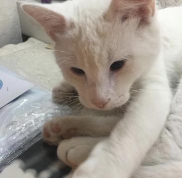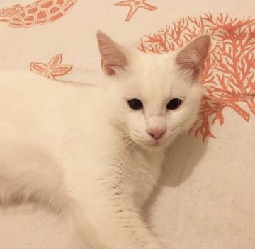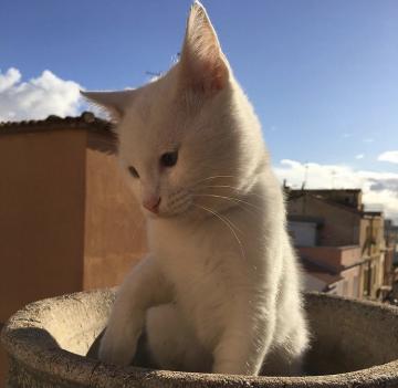 GATTO BIANCO con gli occhi azzurri di nome Topo (ca. 5 mesi) è stato smarrito il 14/10/21 nel centro storico di Olbia. È socievole e affettuoso. Senza collare. È SORDO!!!! Non sente i pericoli per questo ha bisogno di protezione!