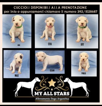 Non solo allevatori, ma una vera e propria famiglia con una grande passione e grandi competenze che lavorano per la selezione del dogo argentino. Il nostro amore per questa splendida razza ci ha portato ad ottenere importanti risultati, non ultimo, il riconoscimento da parte di ENCI E FCI dell'affisso di cui fieramente portiamo il nome. I nostri cani, la loro educazione e la loro salute sono un'assoluta priorità nel nostro lavoro, la nostra selezione si prefigge l'obiettivo di avere cani sani, forti, nel rispetto dello standard di razza e soprattutto equilibrati, ecco perché molti dei nostri cuccioli vengono ceduti a famiglie che se ne possano occupare con amore e impegno. La selezione dei nostri cuccioli parte dalla scelta di femmine e maschi che siano non solo belli esteticamente ma soprattutto affidabili e sociali con l'essere umano. Il nostro impegno va oltre la selezione iniziale, grazie infatti alle nostre competenze in campo etologico e cinofilo, studiamo per i cuccioli un vero e proprio percorso educativo nei primi due mesi di vita che comprende: sessioni di "bio sensor" volte a migliorare sia le difese immunitarie che l'intelligenza dei cuccioli, percorsi di desensibilizzazione all'acqua e ai rumori affinché da adulto non maturi fobie e paure immotivate, classi di comunicazione con cani tutor presenti in struttura diversi dalla madre e dal padre affinché imparino le regole della socializzazione e ovviamente iniziamo ad introdurre l'insegnamento dell' uso corretto del collare e del kennel. Venite a conoscerci e a conoscere i nostri meravigliosi dogo argentino, oltre ai cuccioli, potrete vedere anche la loro mamma, il papà e le nonne che vivono con noi! Per ulteriori informazioni non esitate a contattarci telefonicamente. MY ALL STAR - ALLEVAMENTO DOGO ARGENTINO