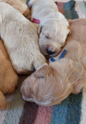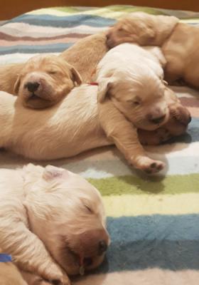 Splendida cucciolata di Golden Retriever nata il 13 gennaio 2024 di linea inglese. I nostri cuccioli nascono da genitori selezionati, controllati per le malattie ereditarie e con carattere equilibrato, sono allevati in famiglia costantemente seguiti nella crescita ed alimentati con prodotti di altissima qualità. Vengono consegnati non prima dei 70 giorni con microchip, pedigree, prima vaccinazione, sverminazioni, libretto sanitario e certificato di buona salute.
