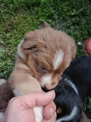 Disponibili cuccioli di pastore australiano dai primi di agosto in poi sono senza pedigree. due sono black tricolor e tre red bicolor tutti maschietti. La mamma è red bicolor e il babbo black tricolor.