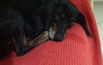 È una cagnolina che ha subito maltrattamenti( le hanno tagliato la coda e ha delle cicatrici sul dorso dovute alle sigarette) è stata lasciata per strada incinta ed ha rischiato di morire. Purtroppo i suoi cuccioli erano tutti morti in pancia.